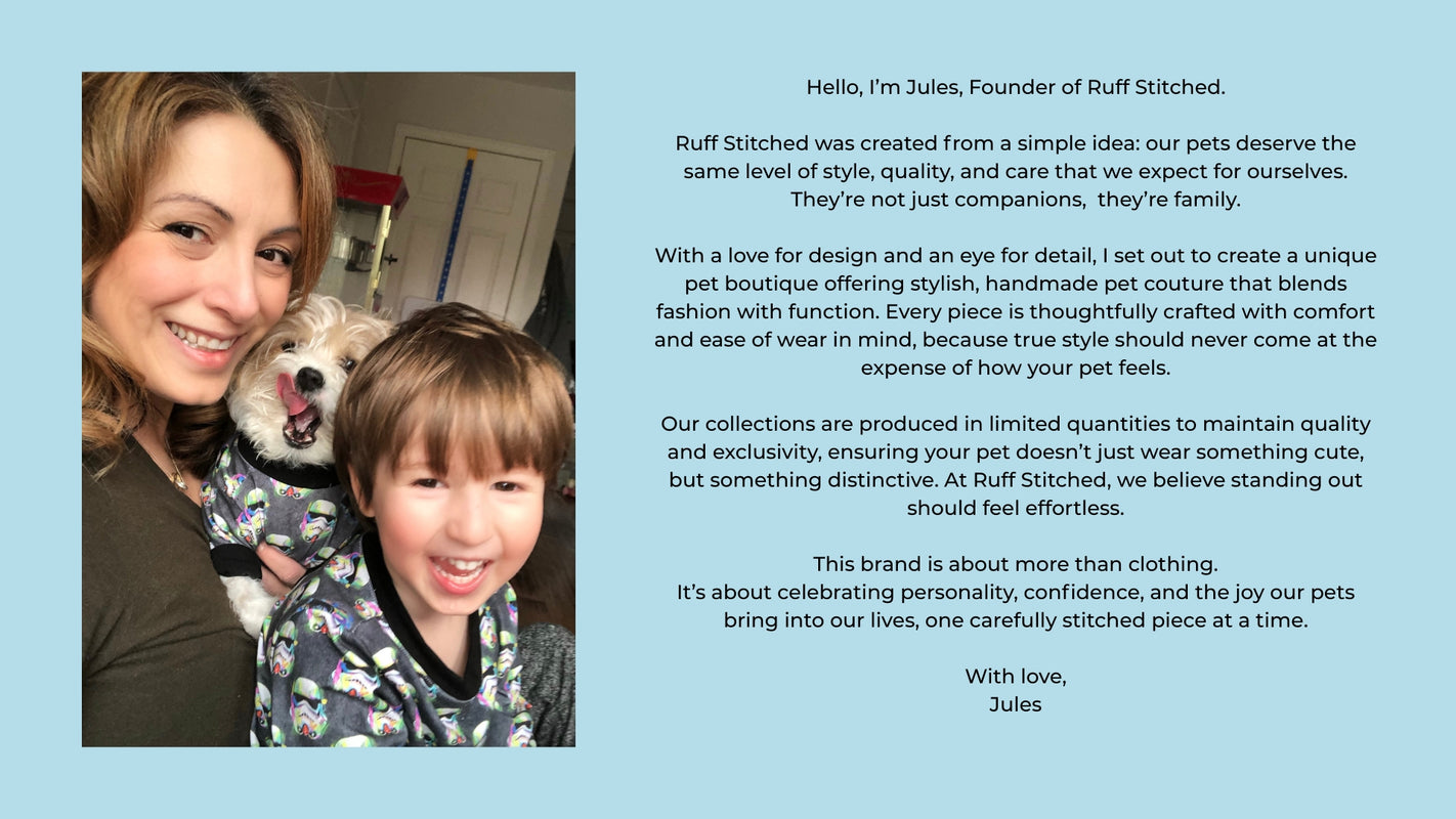 Bella and I absolutely love Ruff Stitched clothing!! Not only are all the items we've received of top quality, but the owner is truly passionate about the business and wants to make everything pawfect!!! We love Ruff Stitched!